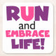 Se você gosta de correr, correr 5Ks, 10Ks, meia maratona, ou maratonas, você vai adorar este design de texto colorido em roxo e rosa que lê Run and Embrace Life! Correr e Abraçar T-shirts, bolsas, canecas, cartões, autocolantes, iPhone e outras capas de dispositivos eletrônicos, ímãs, conselhos de apagar a seco, relógios, travesseiros decorativos, placas de papel e guardanapos, guardas, e muito mais!