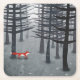 Uma raposa vermelha selvagem se situa entre os pinheiros de uma floresta escura. Uma pintura paisagística para a vida selvagem, natureza e amantes de os animais.