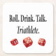 Bring instant fun to the table with this modern paper coaster featuring three bold red dice and the playful phrase “Roll. Drink. Talk. Triathlete.”