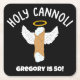 Estas portas copos divertidas são perfeitas para festas de aniversário e muito mais. Eles apresentam o slogan HOLY CANNOLI acima uma ilustração de um cannoli com asas halo e anjo. Sua mensagem personalizada aparece abaixo do gráfico. O texto em branco a negrito é colocado sobre um fundo preto.