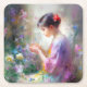 Porta-copo De Papel Quadrado Garota admirando uma flor em suas mãos