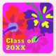 Graduation party paper coasters with custom year. Hibiscus flowers art in bold colors cover these square, disposable coasters. "Class of year" is in bright yellow, chunky printed text. Other colors are bright pink, purple, and red.