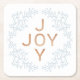 Design de porta copos de natal simples e elegante, com "JOY" gravado em letras grandes em negrito sobre um fundo branco com elementos botânicos azuis empoeirados.