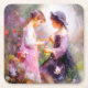 Duas garotas num jardim de flores, admirando uma flor de lavanda. Excelente para arte infantil.