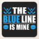 A porta copos da Linha Azul de Hockey apresenta pincéis azuis e bastões de hóquei com texto branco e azul que lê A Linha Azul é Minha.