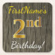 Esta simples design de porta copos de papel apresenta uma mensagem como "segundo aniversário do PrimeiroNome!", com o "segundo" a ter uma aparência falsa/imitada de cor dourada, sobre um fundo com um padrão de aparência rústico de madeira falsa. O nome pode ser personalizado. Portas copos de papel personalizadas como estas poderiam talvez ser usadas numa festa de aniversário para alguém que comemora seu segundo aniversário. [~Z0000198]