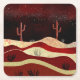 Cena de paisagem abstrato de um deserto com saguaro cactus, escova esfregada, colinas e estrelas em tons de vermelho, creme, bege e texturas ousadas.