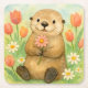 Uma porta copos com uma ilustração aquática de uma lontra-branca lúdica segurando uma flor margarida rosa, com tulipas primavera e margaridas brancas à sua volta