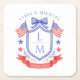 This patriotic wedding coaster design features a watercolor crest with a light red white and blue patriotic crest with American flags and a blue bow. You can personalize with your monogram, wedding date and names.