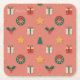 This coaster has a seamless Christmas pattern design on a pink background. The pattern consists of holiday elements including green Christmas wreaths with red bows, white and red gift boxes with brown bows, yellow stars, green Christmas trees and red and green holly leaves with berries. The color palette consists of coral pink, forest green, bright red, and warm yellow, creating a warm, festive holiday atmosphere. The coaster is a square paperboard coaster. There are six coasters in the set. The coaster dimensions are 4" by 4". You can replace the name Mary with the Personalize button.