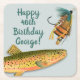 Copos de bebida para festa com tema de pesca com mosca e texto personalizado. Adicione “Feliz aniversário + nome” ou texto de congratulações nos copos descartáveis. Fundo azul claro com trutas manchadas e imagens de mosca de pesca.