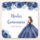 Esta porta copos de Quinceanera apresenta uma bela princesa num vestido azul de bola marinho com arranjos florais. Isto é perfeito para uma festa de Quinceanera.