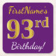Esta simples design de porta copos de papel apresenta uma mensagem como "O 93º Aniversário do Primeiro Nome!", com o "93º" a ter uma aparência falsa/imitada de cor dourada, num fundo cor roxa. O nome pode ser personalizado. Portas copos de papel personalizadas como estas poderiam talvez ser usadas numa festa de aniversário para alguém que comemora seu 93º aniversário. [~Z0000197]
