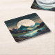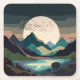 Uma paisagem abstrato de uma enorme superlua em uma cena de lago montanhês com um bando de pássaros em texturas ousadas e tons escuros de marrom, bege, bronzeado, azul, ciano e preto.