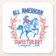 Este design patriótico de tendência apresenta um retrô vintage Americana de desenho de uma vaqueira andando a cavalo com o ditado "All American Sweetheart Cowgirl Club".