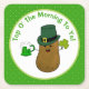 Batata irlandesa bonita e feliz vestindo um chapéu verde com banda preta e uma fivela amarela. Ele tem um shamrock de sorte em uma mão e um pint de cerveja verde na outra. Um modelo de texto em verde sobre a cabeça dele diz "Top O' The Morning to ya" . A design é definida como dentro de um círculo branco com uma borda verde. O fundo é verde com pequenas bolinhas brancas.