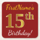 Esta simples design de porta copos de papel apresenta uma mensagem como "Aniversário do 15 do Primeiro Nome!", com o "15" a ter uma aparência falsa/de cor dourada, num fundo de cor vermelha. O nome pode ser personalizado. Portas copos de papel personalizadas como estas poderiam talvez ser usadas numa festa de aniversário para alguém que comemora seu décimo quinto aniversário. [~Z0000195]