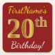 Esta simples design de porta copos de papel apresenta uma mensagem como "Aniversário do 20 do Primeiro Nome!", com o "20" a ter uma aparência falsa/de cor dourada, num fundo de cor vermelha. O nome pode ser personalizado. Portas copos de papel personalizadas como estas poderiam talvez ser usadas numa festa de aniversário para alguém que comemora seu vigésimo aniversário. [~Z0000195]