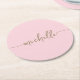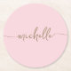 Bique de papel redondo personalizado com monograma moderno em rosa e dourado, com nome e assinatura em grafia manuscrita. Este design apresenta seu primeiro nome em uma linda tipografia de letra manuscrita com cauda ornamentada em cor dourada sobre um fundo rosa bebê claro ou rosa rosado. Muito fácil de personalizar. Ótimo presente feminino e elegante para aquecimento de casa, também para aniversário, chá de noiva, casamento, festa de aniversário de 16 anos, dia das mães, chá de bebê, para festa de formatura e é para a garota que ama coisas únicas e minimalistas.