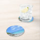 A paper coaster (sturdy pulp board) with a scenic tropical photograph. A secluded beach with white sand and turquoise water.