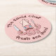 Cartoon de chef rosa com bigode segurando faca e garfo de cozinhar. Cor de fundo personalizada. Dois campos de texto personalizados em círculo.