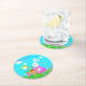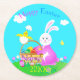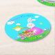 Um coelhinho cor-de-rosa com uma cesta de Páscoa cheia de ovos coloridos de Páscoa, um pintinho que acabou de eclodir, e uma mensagem de "Felz pascoa".