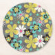 Conjunto de 6 portas copos redondas descartáveis de conselho de polpa, com uma imagem de flores amarelas, pretas, turquesas e brancas distantes nas cinzas.Veja portas copos de plástico e guardanapos correspondentes. Veja toda a coleção de Portas copos Psychedelic 60s na COMIDA/BEV| Seção Porta copos.