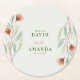 Este porta-copos de papel para casamento personalizável apresenta flores vermelhas pintadas com aquarela e folhas verdes cinzentas em um fundo verde pálido, com espaço para texto personalizado.