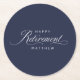 Esta porta copos de papel clássico do partido aposentado personalizada com o nome da honraria é simples e elegante. A palavra "Aposentadoria" é escrita em uma caligrafia elegante escrita emparelhada com uma simples fonte sans serif. Mostrado aqui em azul marinho com texto branco, personalize o modelo de texto fácil de usar com o nome do convidado de honra.