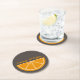 Uma porta copos marrom com meia fatia laranja e texto personalizável. Pode ser usado quando você recebeu amigos ou familiares em casa ou em um bar!