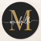 Base de papel redonda personalizada elegante simples e moderna com monograma preto e dourado, nome inicial e assinatura personalizada. Este design apresenta seu primeiro nome em uma linda tipografia de letra manuscrita com rabiscos (ou caligrafia) com monograma inicial em dourado e branco sobre preto. São fáceis de personalizar. Ótimo presente feminino e elegante de inauguração, também para aniversário, casamento, festa de 16 anos, chá de noiva, dia das mães, chá de bebê, festa de formatura e é para a garota que ama coisas minimalistas únicas e estilosas.