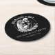 Protect your reception tables with a touch of macabre romance using these custom gothic wedding coasters. The circular design features a striking white illustration of a skeleton bride and groom embracing within a floral wreath, set against a deep black background. Emblazoned with the vow "Till Death Do us Part," these coasters serve a dual purpose: practical drink mats for your open bar and unique personalized favors for your guests to take home. Perfect for a Halloween nuptial or an alternative celebration.
