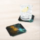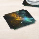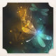 Voo de libélula brilhante, verde, desenhada artisticamente, com asas verdes e amarelas transparentes sobre fundo noturno brilhante com plantas pântanas e vagalumes. Dragonfly brilhante.