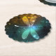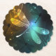 Voo de libélula brilhante, verde, desenhada artisticamente, com asas verdes e amarelas transparentes sobre fundo noturno brilhante com plantas pântanas e vagalumes. Dragonfly brilhante.