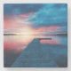 Uma porta copos de pedra com uma linda fotografia. Um lugar cênico. Um lago tranquilo com uma doca de madeira que se estende para fora. Definir o sol fornece lindas cores no céu, vermelho e azul vibrantes.