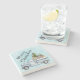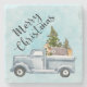 Uma porta copos de pedra com uma design festiva. Um caminhão carregando pinheiros de Natal junto com alguns animais da floresta. Um urso, uma raposa e um veado nas costas, indo dar uma volta. Design criado com aquarelas.