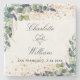Um fundo branco na moda. Decorados com folhas de eucalipto, pererecas, verde e impermeáveis de ouro. Pó de ouro puro. Personalize e adicione seus nomes e a data do casamento. O nome é escrito com um moderno estilo escrito à mão.