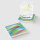 Uma paisagem abstrato com cores e texturas vibrantes mostrando colinas flutuando no gelo em tons de verde, azul, ciano, vermelho e rosa.
