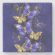 Composição de borboletas luxuosas de safira e joias de ouro em fundo azul texturizado.