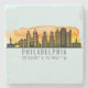 A na moda e a moderna porta copos de pedra apresenta a silhueta do horizonte da cidade da Pensilvânia, Filadélfia, com o plano de fundo de cor d'água do pôr do sol e as coordenadas do mapa de latitude e longitude em fundo azul pálido. Excelente para sua própria casa ou como um Filadélfia, guarde para os outros.