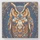 Representação geométrica de uma coruja com cores vibrantes e detalhes intrincados, colocada contra um fundo de céu noturno estrelado. As características da coruja, incluindo seus olhos e penas, são definidas de forma nítida, dando-lhe uma aparência artística e moderna.