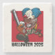 Uma recordação de porta copos de palhaço louca para seus convidados de festas de Halloween. Use "Personalizar este modelo" para ajustar o texto "HALLOWEEN 2025" e fazer um presente exclusivo e personalizado. Algo a ser tirado da festa do Halloween, com um palhaço maníaco colorido, com uma motosserra laranja, com cabelo azul selvagem e vestindo um rufo, calçados palhaços massivos e leggings e capas listradas.