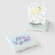 Uma porta copos de pedra com uma ilustração adorável. Um golfinho azul e roxo cercado por bonito plantas submarinas coloridas.