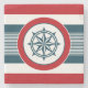 Design náutico com decoração em forma de bússola, em fundo listrado a azul, vermelho e branco