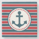 Design náutica com decoração em forma de âncora em forma redonda com estrelas sobre fundo listrado vermelho, azul e branco