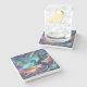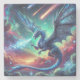 Um dragão azul místico voa através de um céu cósmico vibrante, cercado por poeira estelar, flocos de neve e estrelas atiradoras.