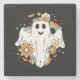 Uma porta copos de pedra com uma ilustração de um fantasma sorridente. Decorado com flores, arco-íris e morcegos.