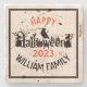 design de modelo de halloween legal e feliz. Design de conceito de tipografia de Spooky Halloween. As letras são feitas com imagens de símbolos de halloween. Morcegos negros, árvores assustadoras. O legal modelo de halloween com nome de família e ano é personalizável.