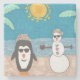 Snowman e pinguins de férias na praia. O que poderia ser mais divertido?