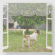 Imagens que olham através de uma janela são dois cães de raposa branca e castanha que exploram o jardim.
